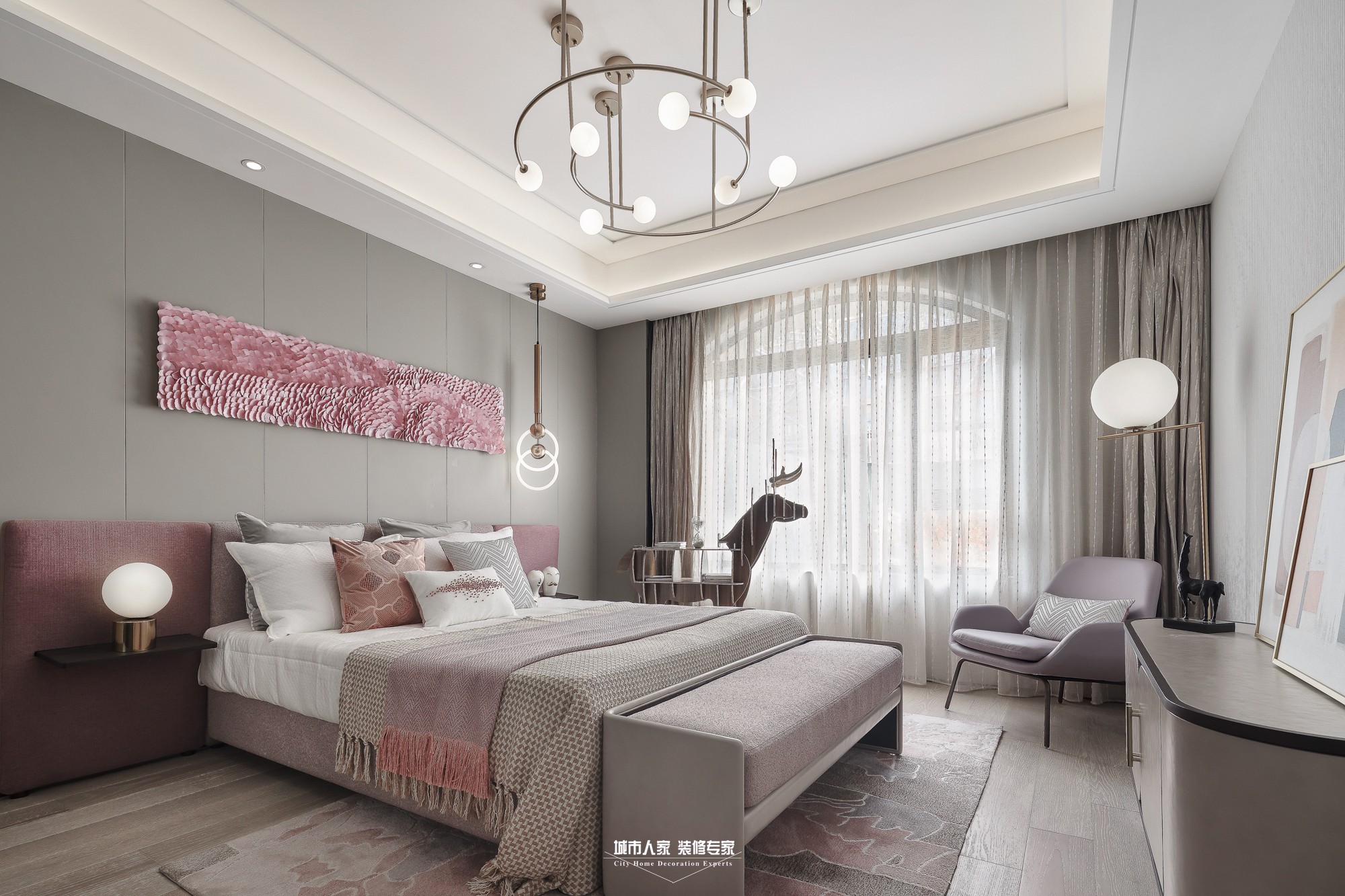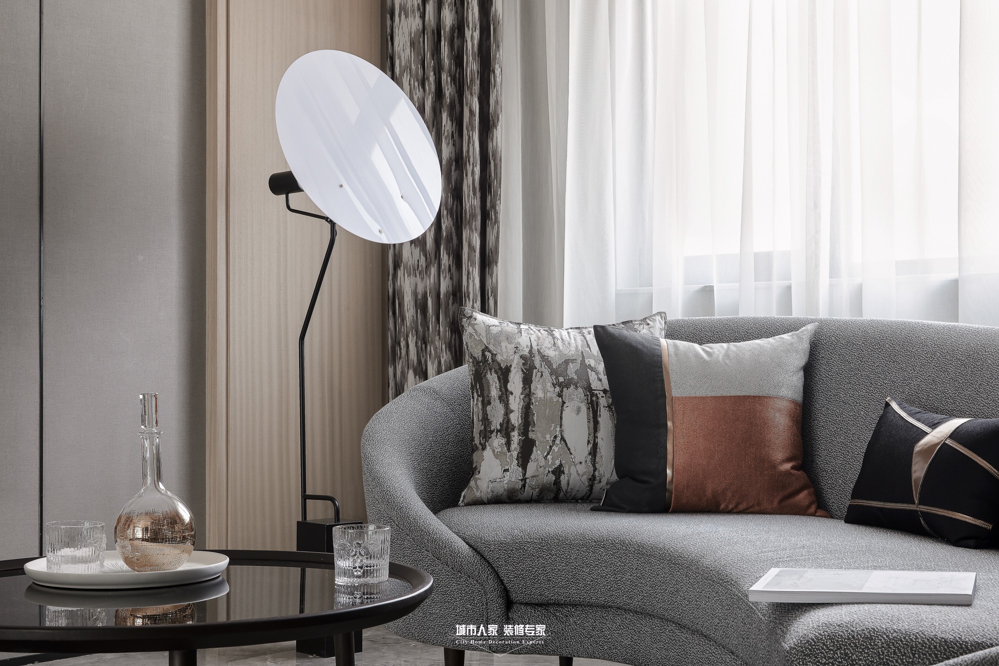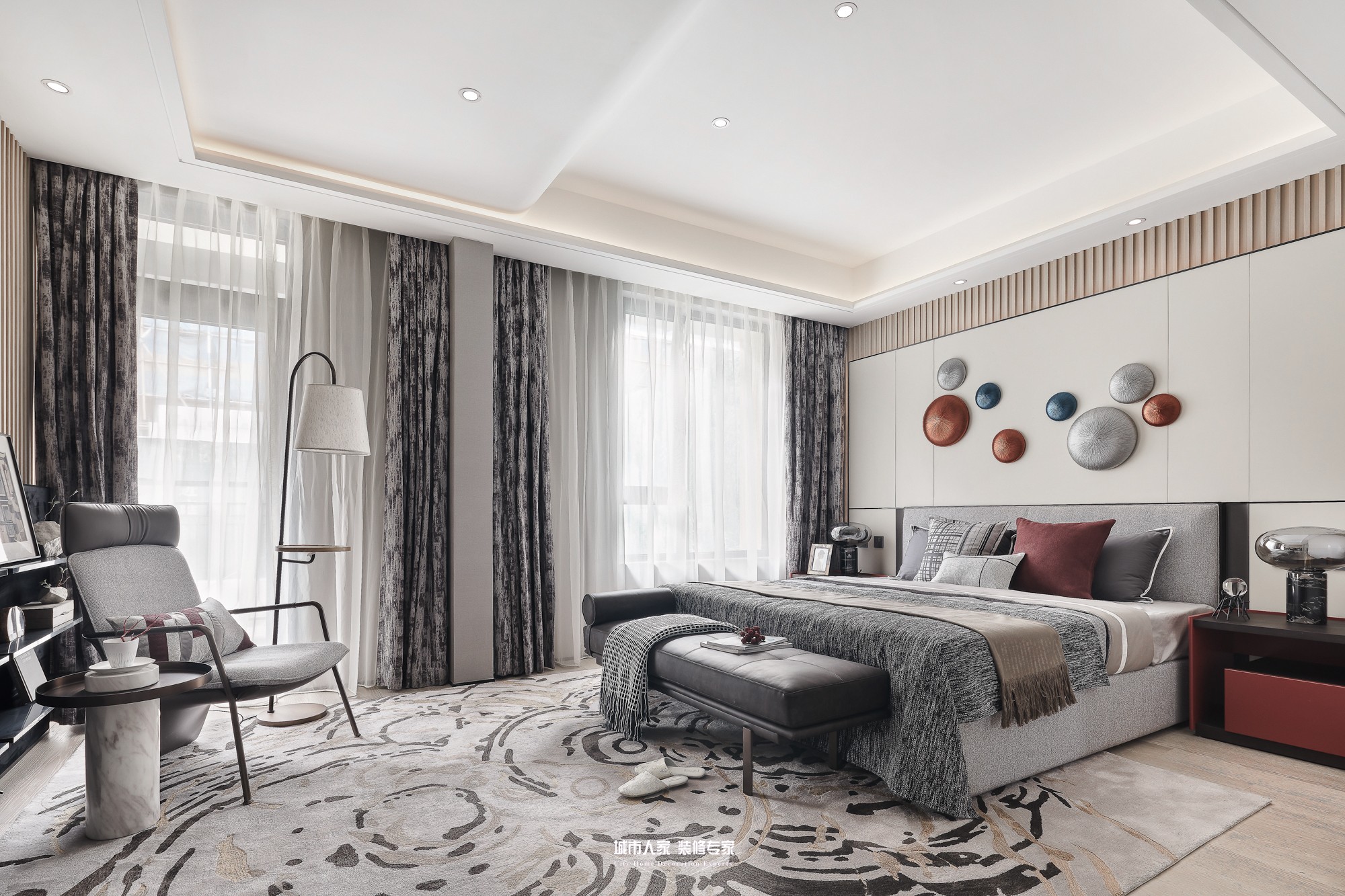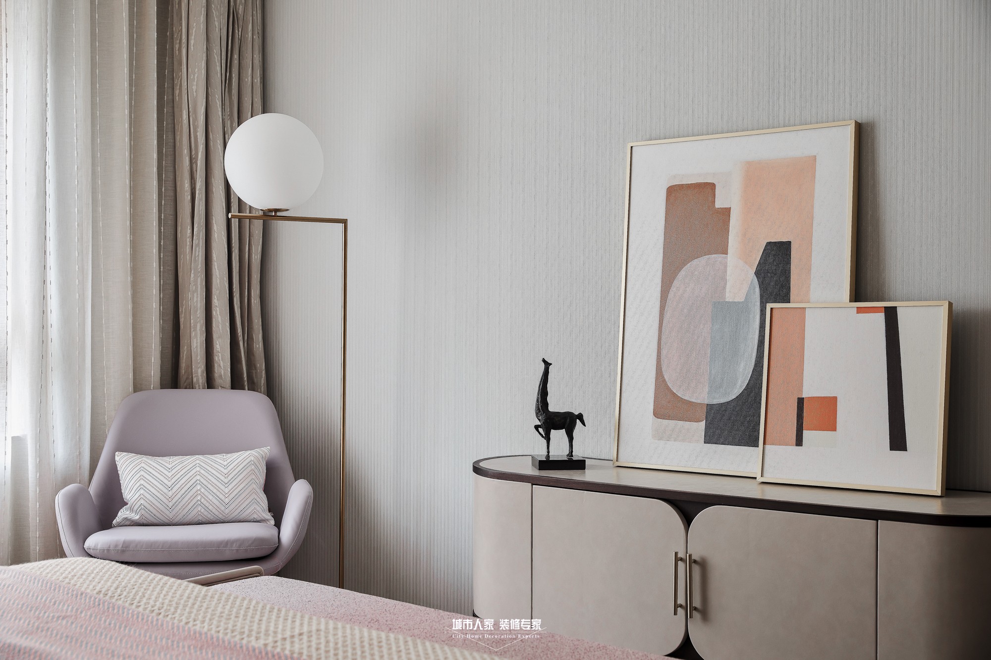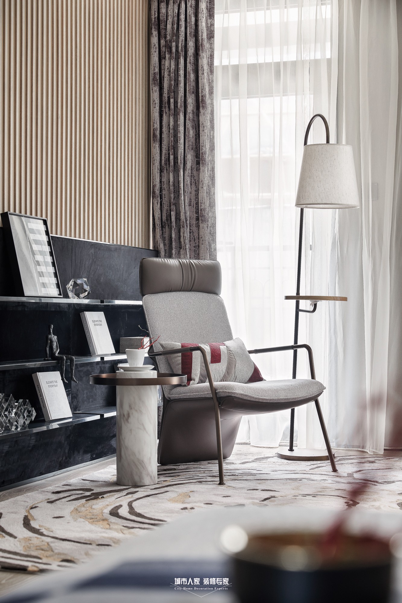 本案為現(xiàn)代主義風(fēng)格,回溯現(xiàn)代主義的源頭,首先想到的是“減”字,只有減少裝飾才能讓空間單純,設(shè)計(jì)滿足工業(yè)生產(chǎn)的要求,然而減得過(guò)多就會(huì)“Less is bore”,不免枯燥,脫離生活。