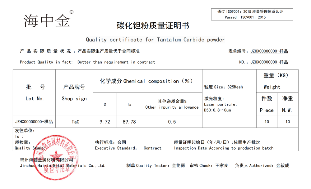 產(chǎn)品名稱:碳化鉭(TaC) 規(guī)格:0.8-10um(D50)   形貌:不規(guī)則 顏色:黑灰色  特點(diǎn):高熔點(diǎn)、‌高硬度、‌高彈性模量、‌良好的化學(xué)穩(wěn)定性和耐腐蝕性 用途:硬質(zhì)合金、‌切削工具、‌軍事、‌電極材料、‌金屬基復(fù)合材料等領(lǐng)域