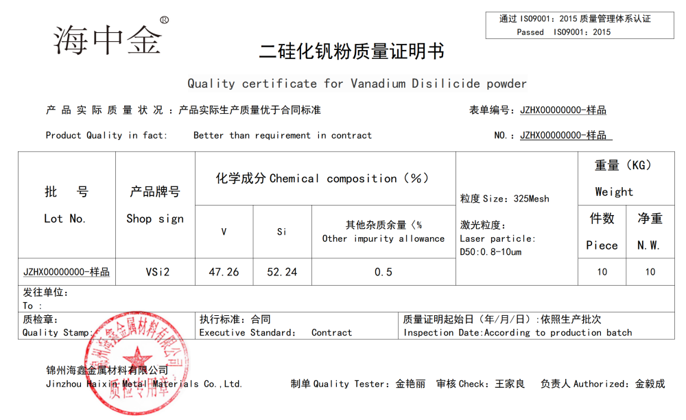 產(chǎn)品名稱:二硅化釩(VSi2) 規(guī)格:0.8-10um(D50)   形貌:不規(guī)則 顏色:黑灰色  特點:抗氧化穩(wěn)定性 用途:制備大規(guī)模集成電路